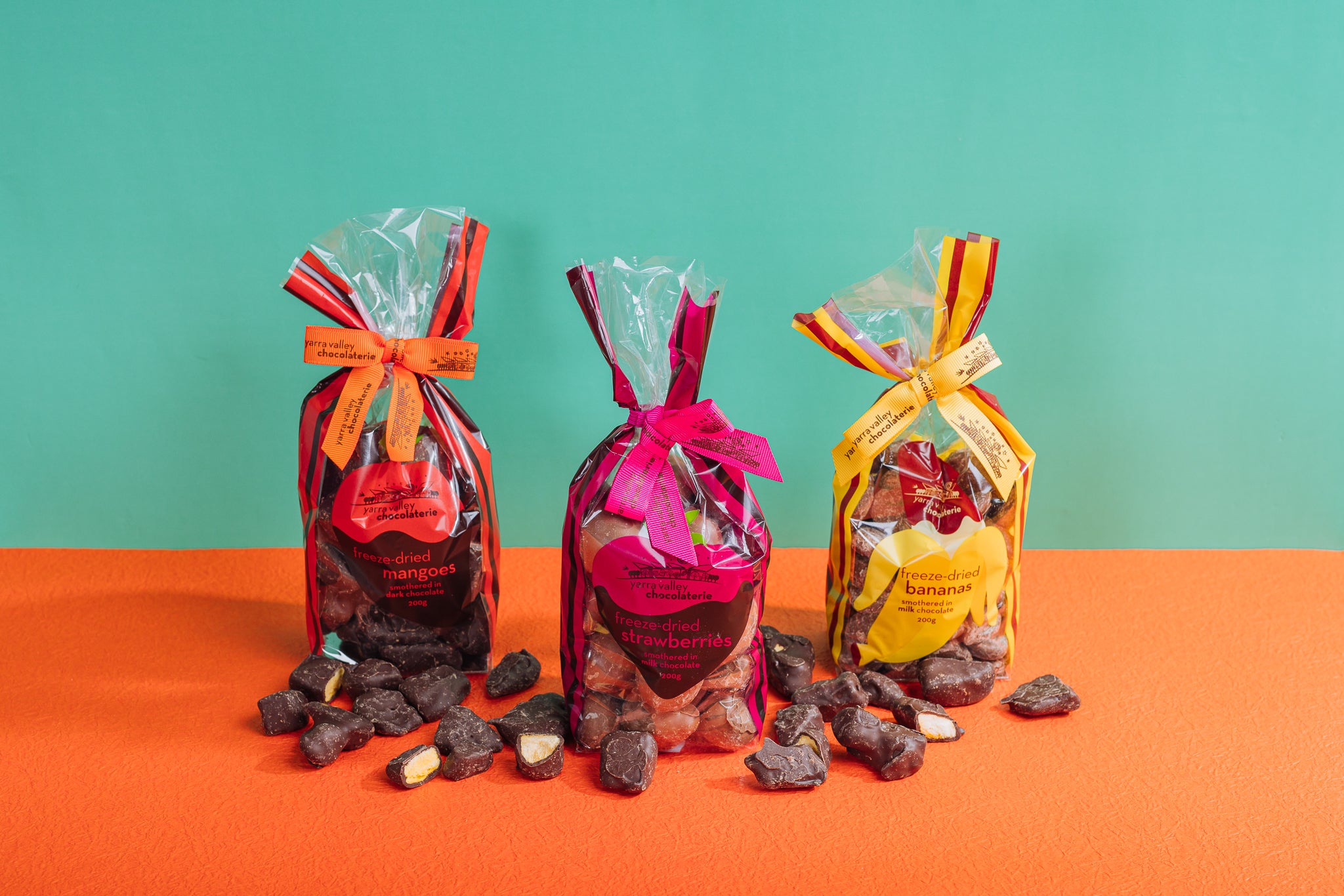 Try our freeze dried fruits coated in decadent couverture chocolate. This delicious treat is made by freezing sweet chunks of fruit and then slowly vacuuming the water content. This process retains the maximum amount of nutrients and taste.