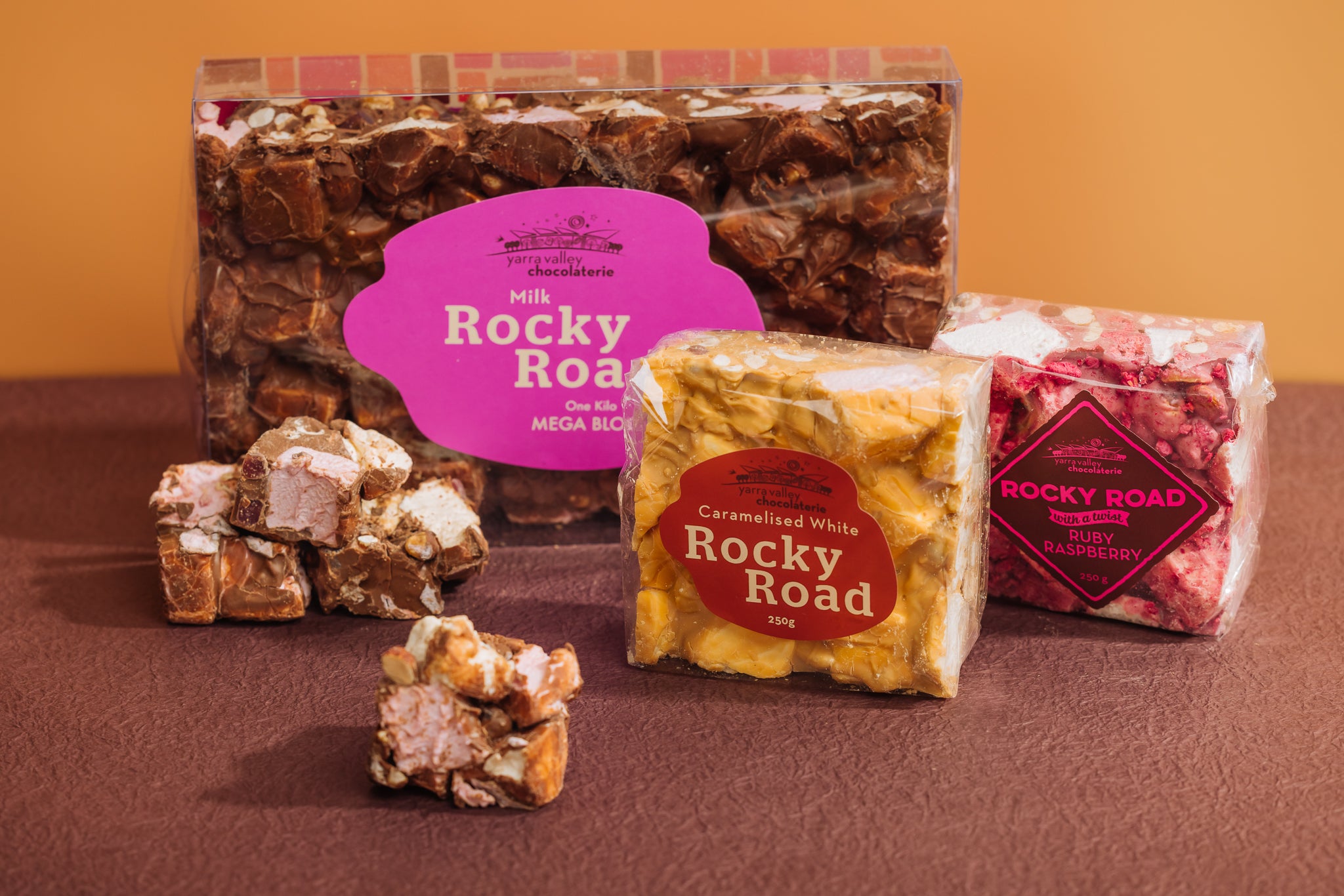 Have you tasted our deliciously addictive Rocky Road? Indulge in fluffy vanilla and berry marshmallows, blended with roasted peanuts, hazelnuts, almonds and red jellies, and then smothered in our handcrafted couverture chocolate.